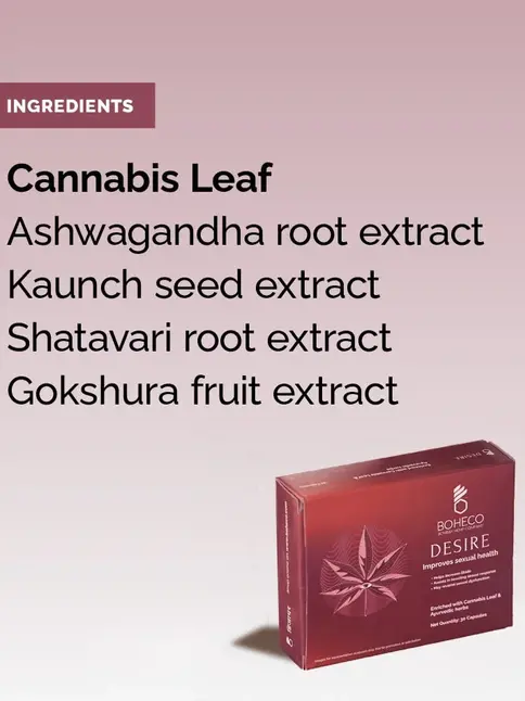 DESIRE is a proprietary Ayurvedic formulation. It works on the body?s Endocannabinoid system (ECS) to maintain and/or improve sexual and reproductive health for both women & men. The full spectrum of cannabinoids in this Vijaya leaf-based medication provides a natural treatment for symptomatic relief.