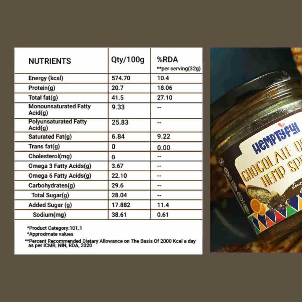 Hemp seeds, Sunflower Oil, Jaggery,Cocoa Solids, Orange Powder, Orange Extract, Nature identical flavouring (Chocolate),Vitamin E, Rosemary Extract