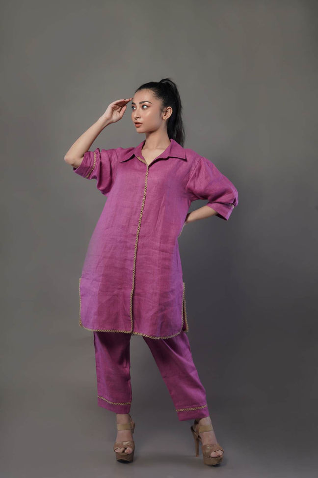 This stylish co-ord is perfect for summer. It features a lavender color, a soft, easy-going hemp fabric, and a jute lace collar. It has pockets and sleeves that work for a more professional look. It's made from hemp, making it comfortable and breathable.