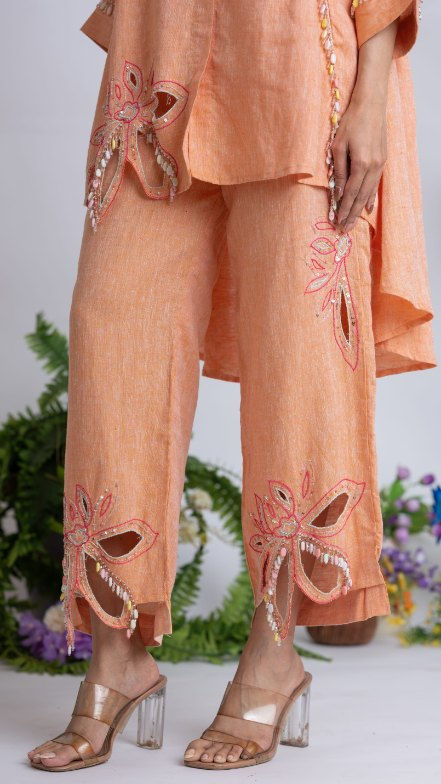This stylish and versatile Blush Soothing Orange Co-ord featuring breathable anti-fit hemp fabric is perfect for all your special occasions. It is crafted with organic and azo-free dyes and hand embroidery by skilled artisans from West Bengal. The set includes a tunic and pants in Soothing Orange. Wear this beautiful co-ord to brunches, birthdays, and other social events.